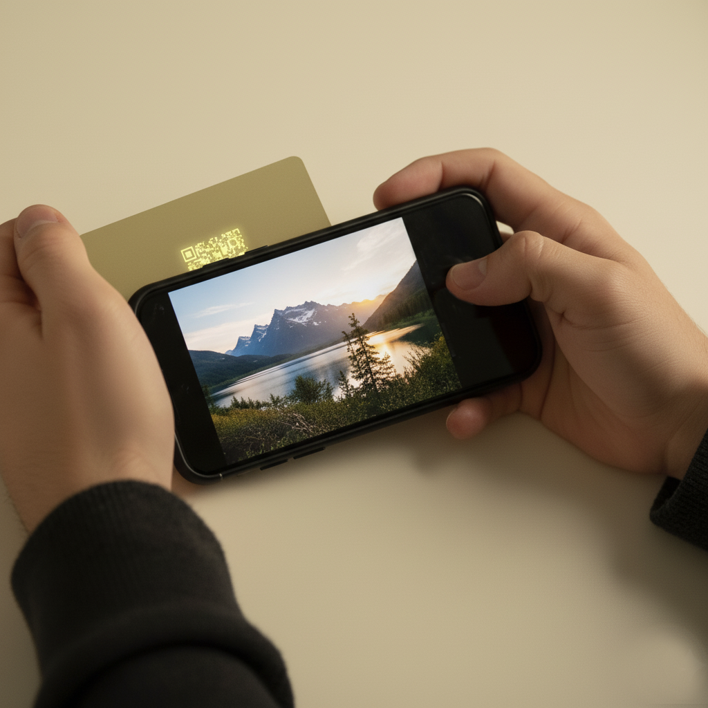Each living postcard is engraved with a unique QR code generated by the Evergram app, tied to the moment you capture. You select a destination in that app (you, a loved one, a friend, etc). We then send that living postcard by mail to your recipient of choice. When they receive it, they scan the QR code and see the special message you've curated just for them.